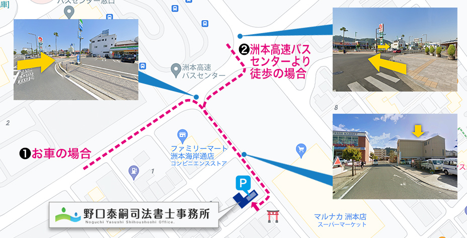 ❶洲本高速バスセンター近くのマルナカ(スーパー)とファミ リーマート(コンビニ)の間の路地を南にお入りください。